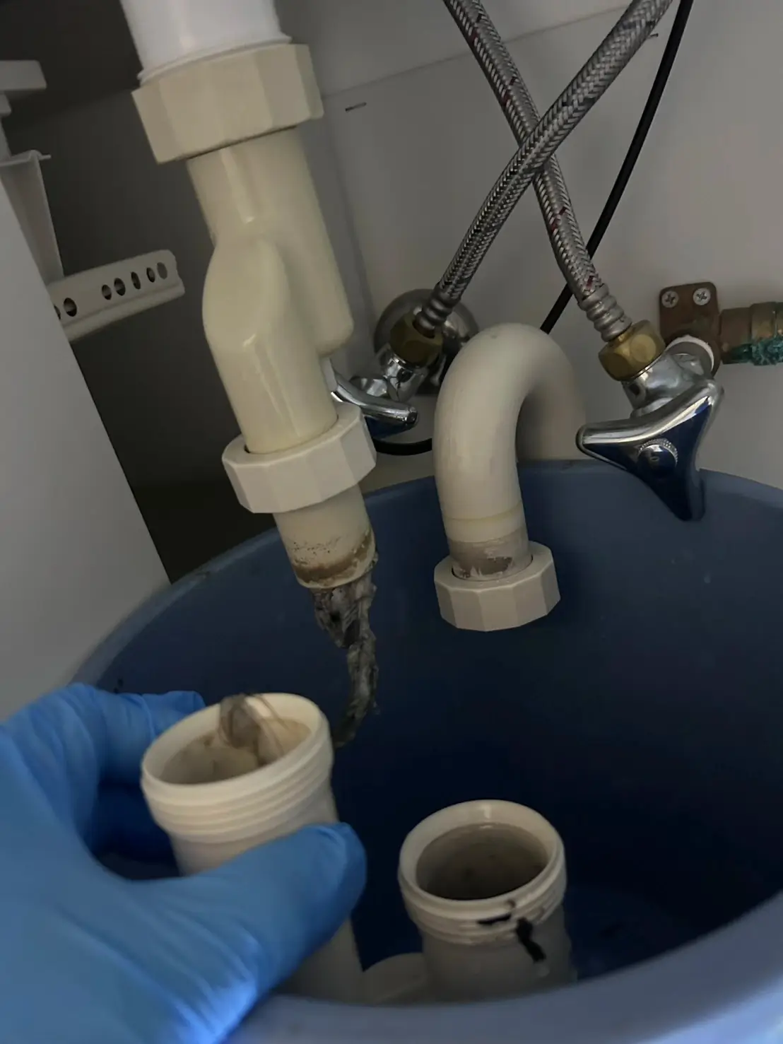 現場を確認したところ、ローポンプでは改善しきれないほど排水トラップ内部に汚れ・髪の毛・石鹸カスなどが固まって詰まりを起こしていました。