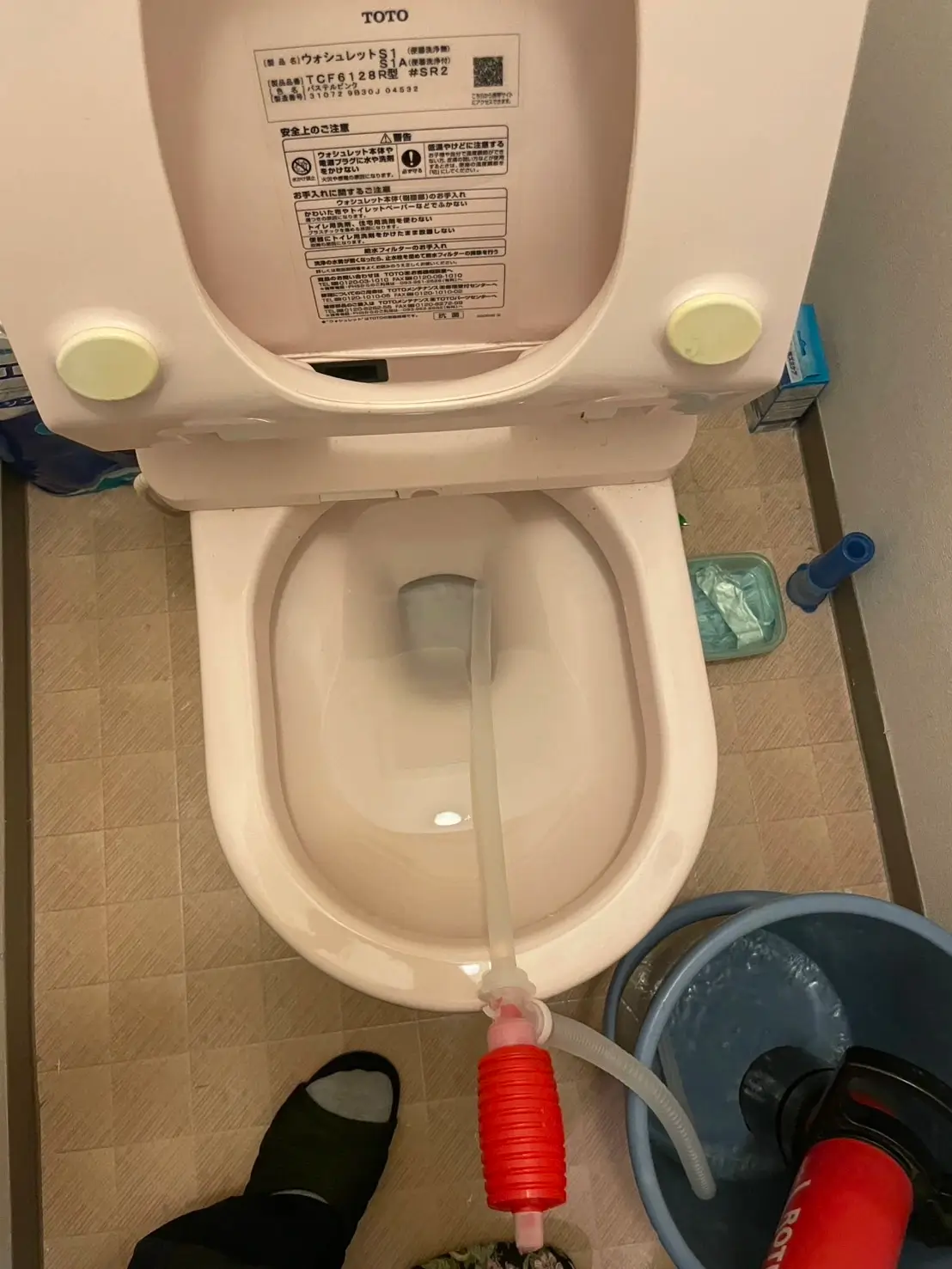 現場を確認すると、便器内の水位が高くなっており、ローポンプ作業のみでは抜けきらない重度の詰まりが疑われる状態でした。