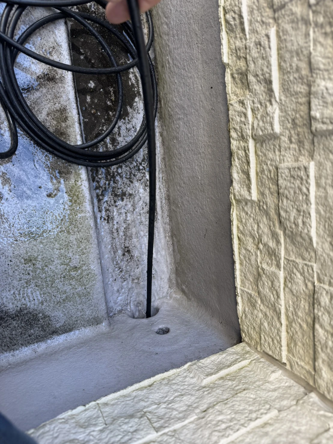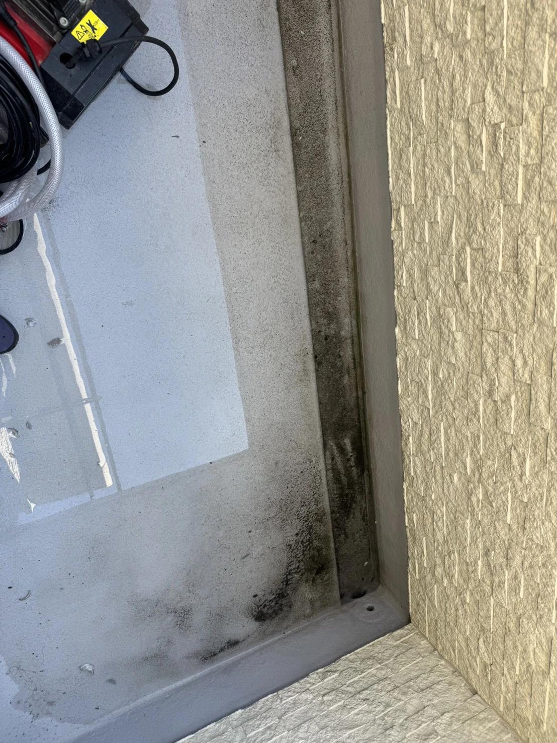 お伺いした際には、バルコニーの排水口から水が引かない状態で、溜まった水があふれかけていました。