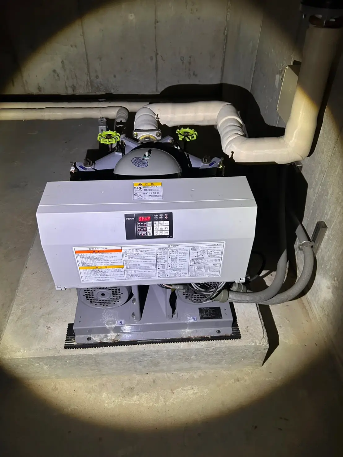 調査の結果、屋外給水管の一部にエア噛み(空気の混入)が発生しており、それにより不安定な水圧が続いていたことが原因でした。