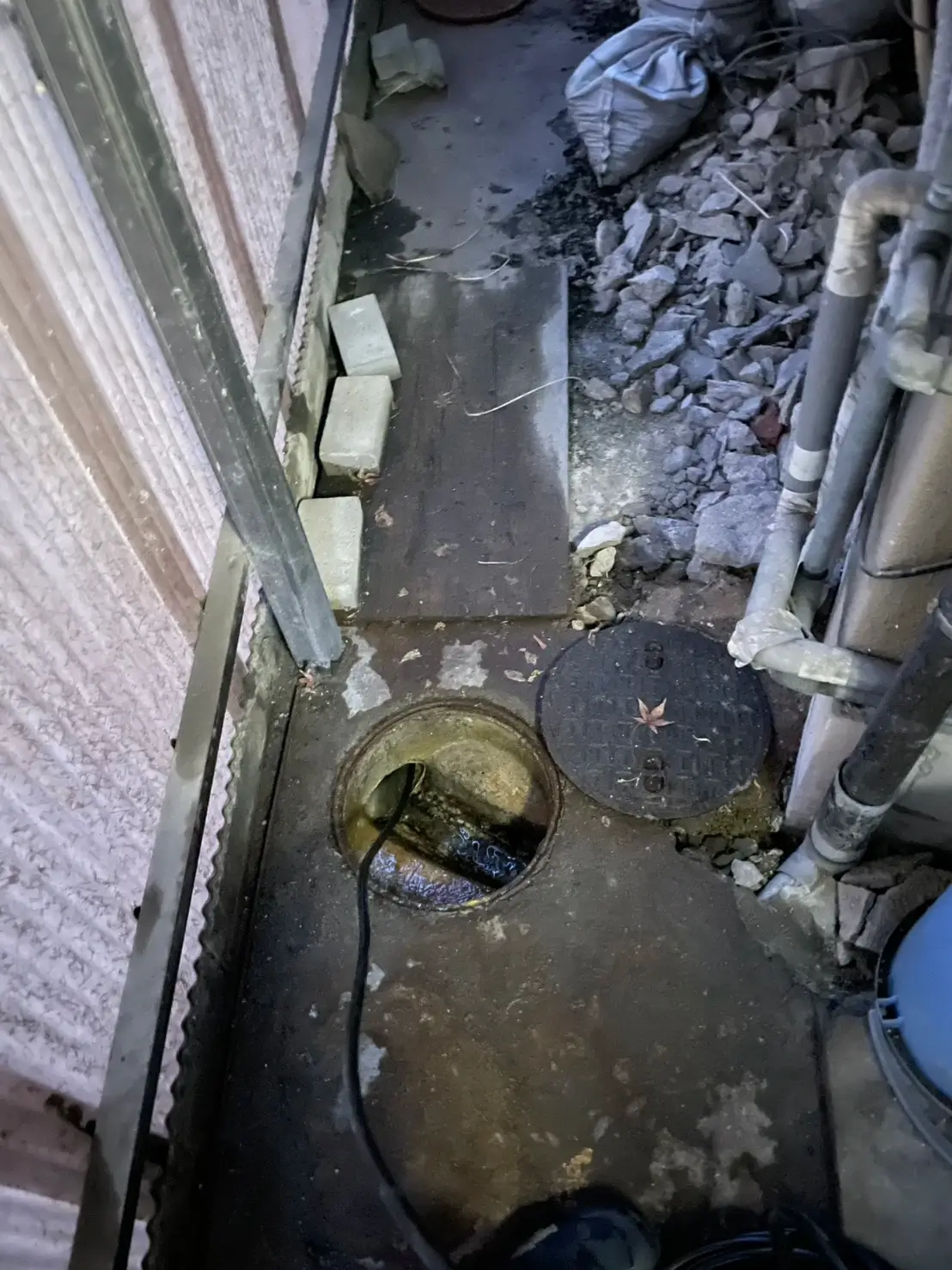 屋外の点検口を開けて確認したところ、排水マス内に汚れや異物が多く堆積しており、詰まりの原因となっていました。