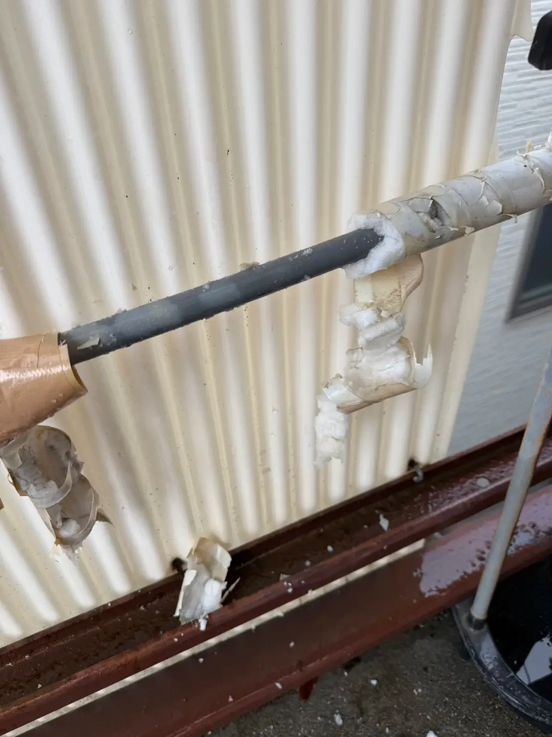 お伺いした際、屋外の給水管が破裂し、水が漏れ出している状態を確認しました。