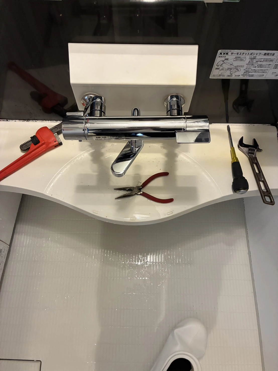 お客様のご要望により新しい浴室水栓の取り付け作業を実施しております。