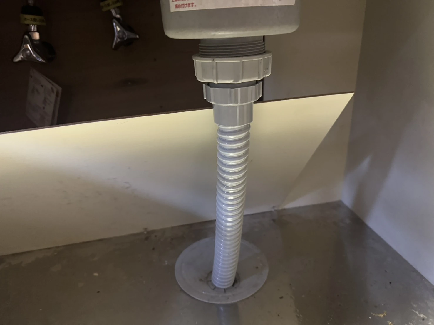 排水ホースを取り外し、周辺部材の状態も点検したうえで新しいホースへ交換しております。