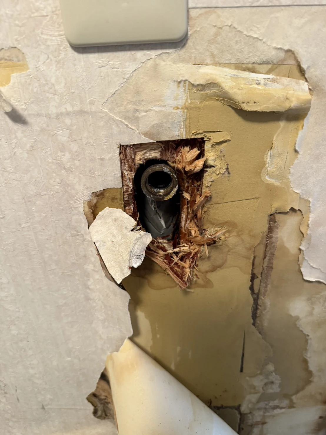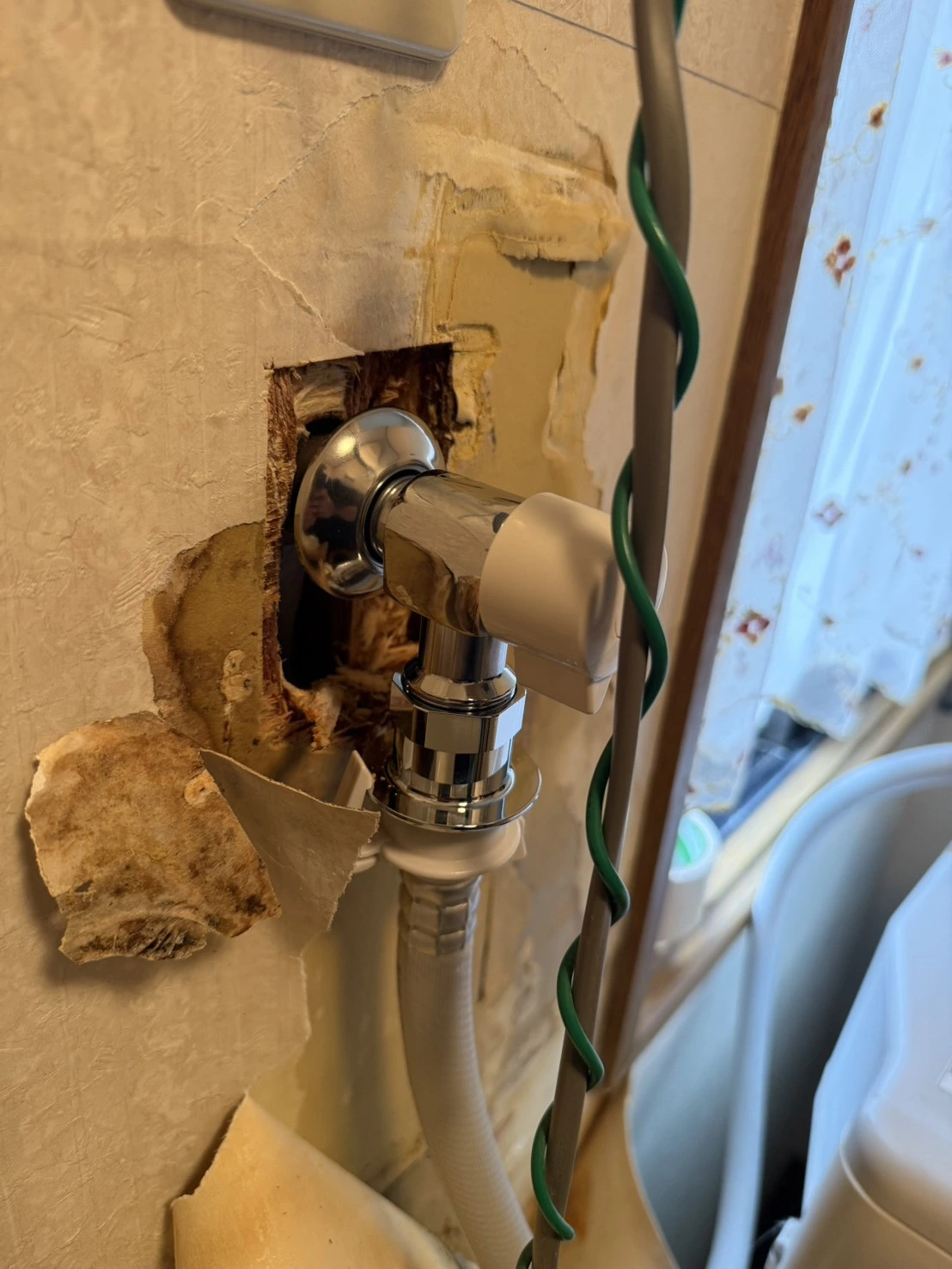 洗濯をしようとしたら、壁がじんわり濡れているのに気づきました。最初はホースかと思ったのですが、壁の中から水が出ている感じでかなり焦りました。