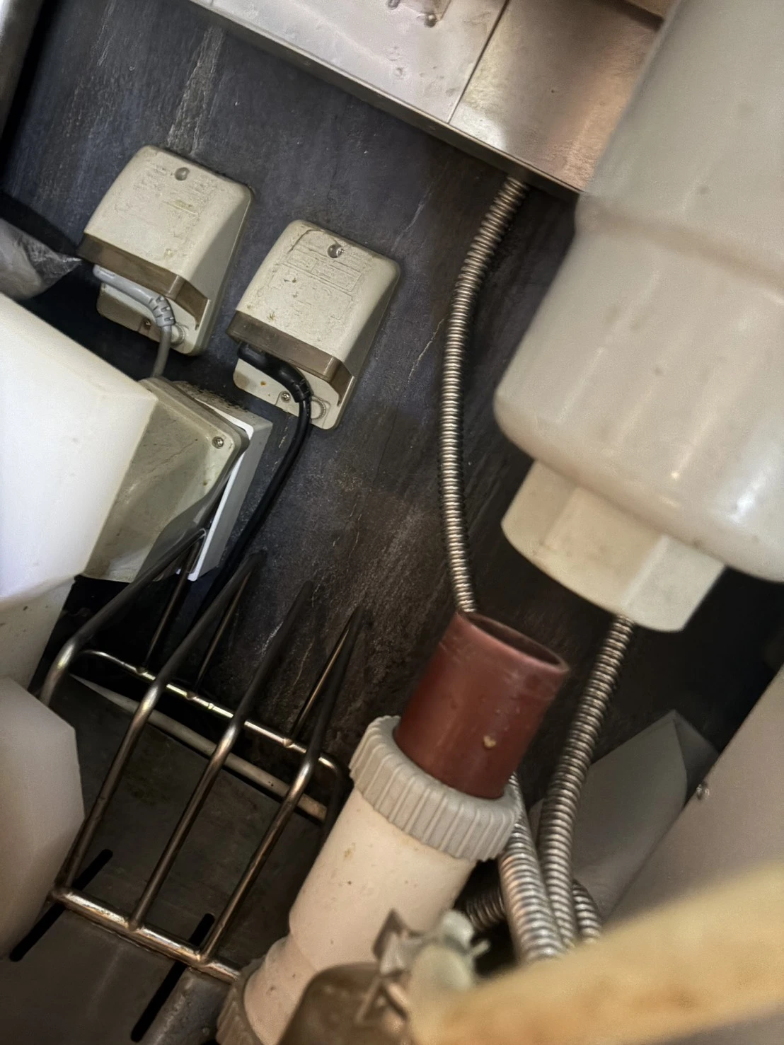 作業中は厨房機器や床を傷めないよう養生しながら進め、周囲の水気にも注意しつつ対応しております。