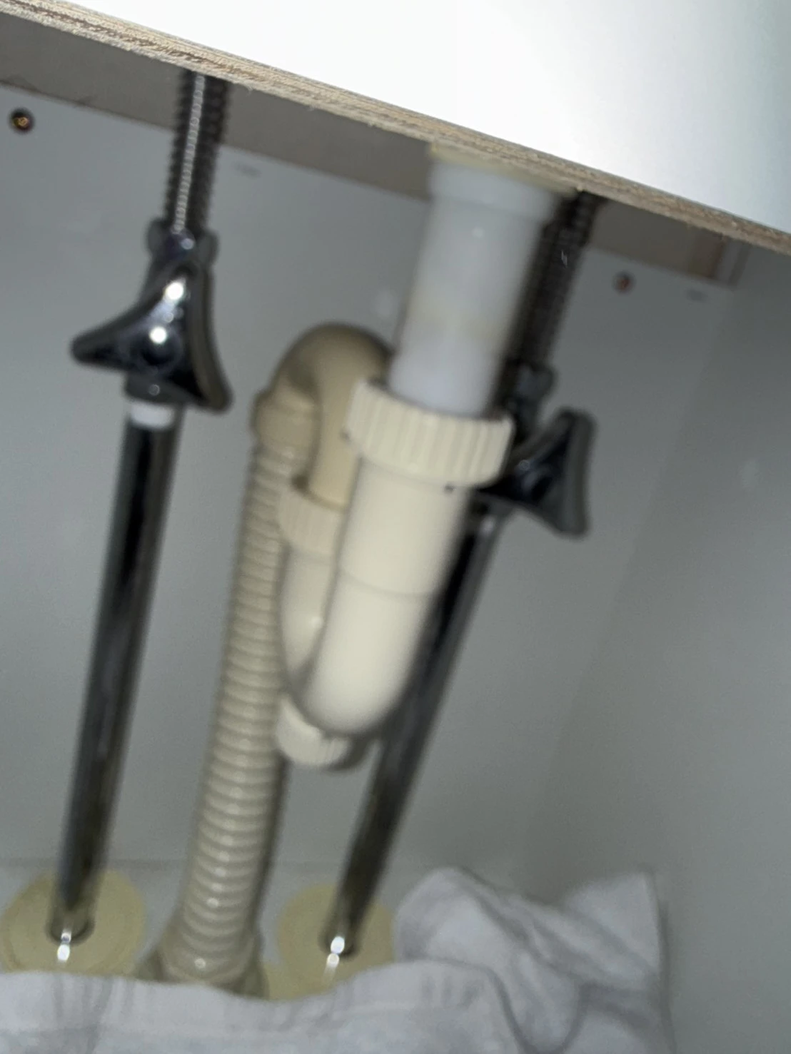 洗面台下の水漏れについて確認したところ、排水トラップの接続部が緩み外れかけている状態でした。