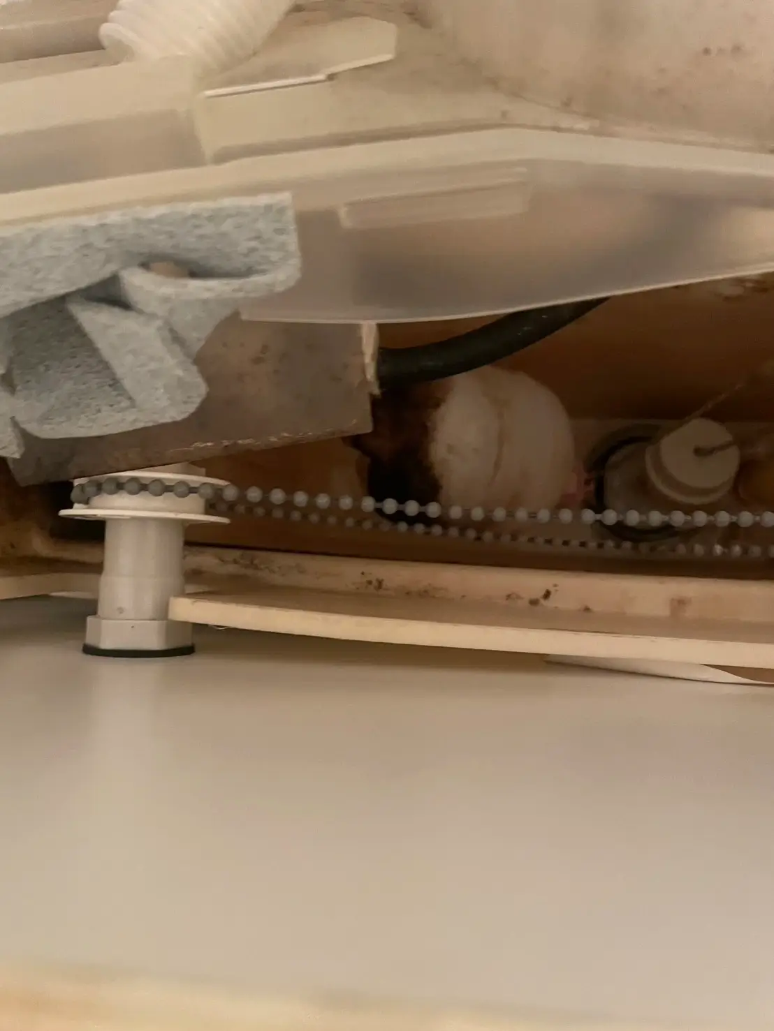 タンク内部を確認したところ、ボールチェーンが外れており、レバー操作が排水弁に伝わっていない状態。