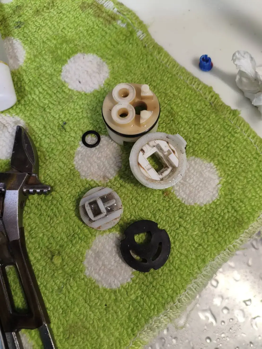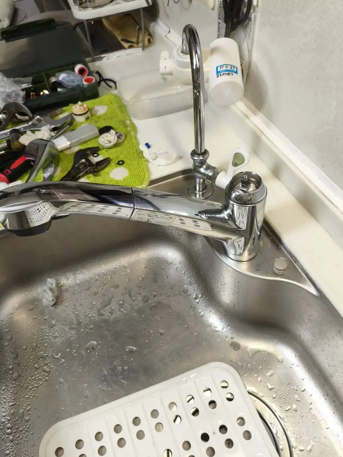 今回は台所蛇口の水漏れとのことで、内部の消耗した部品が原因で隙間から水が漏れている状態でした。
