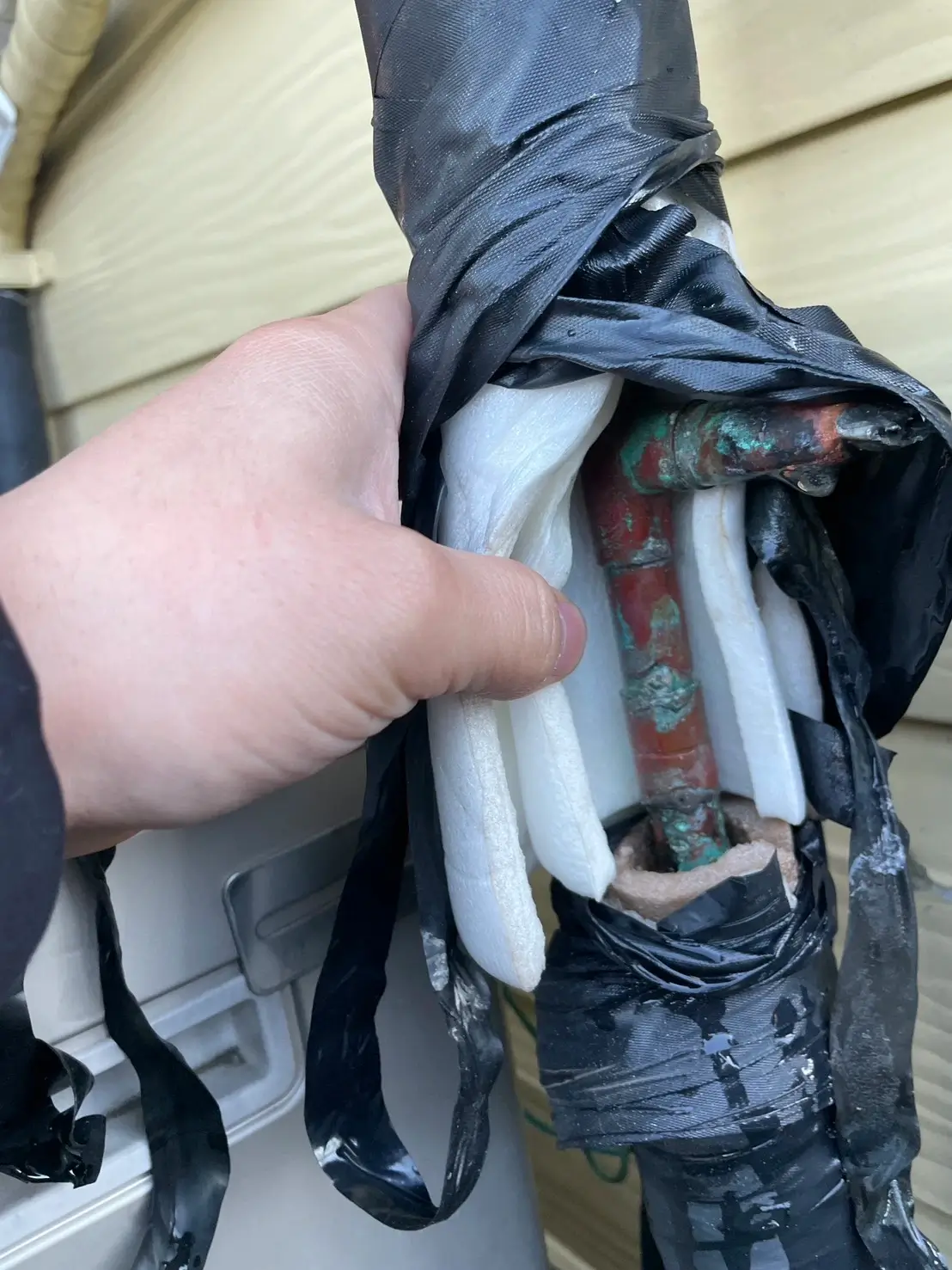 現場にて確認したところ、給湯管の一部が劣化により破裂し、継続的に漏水している状態でした。