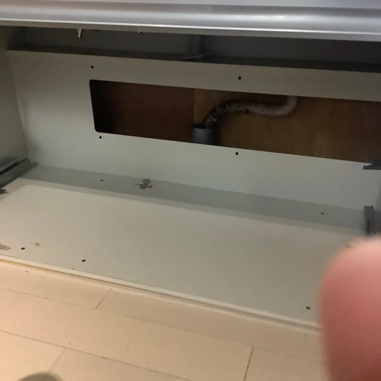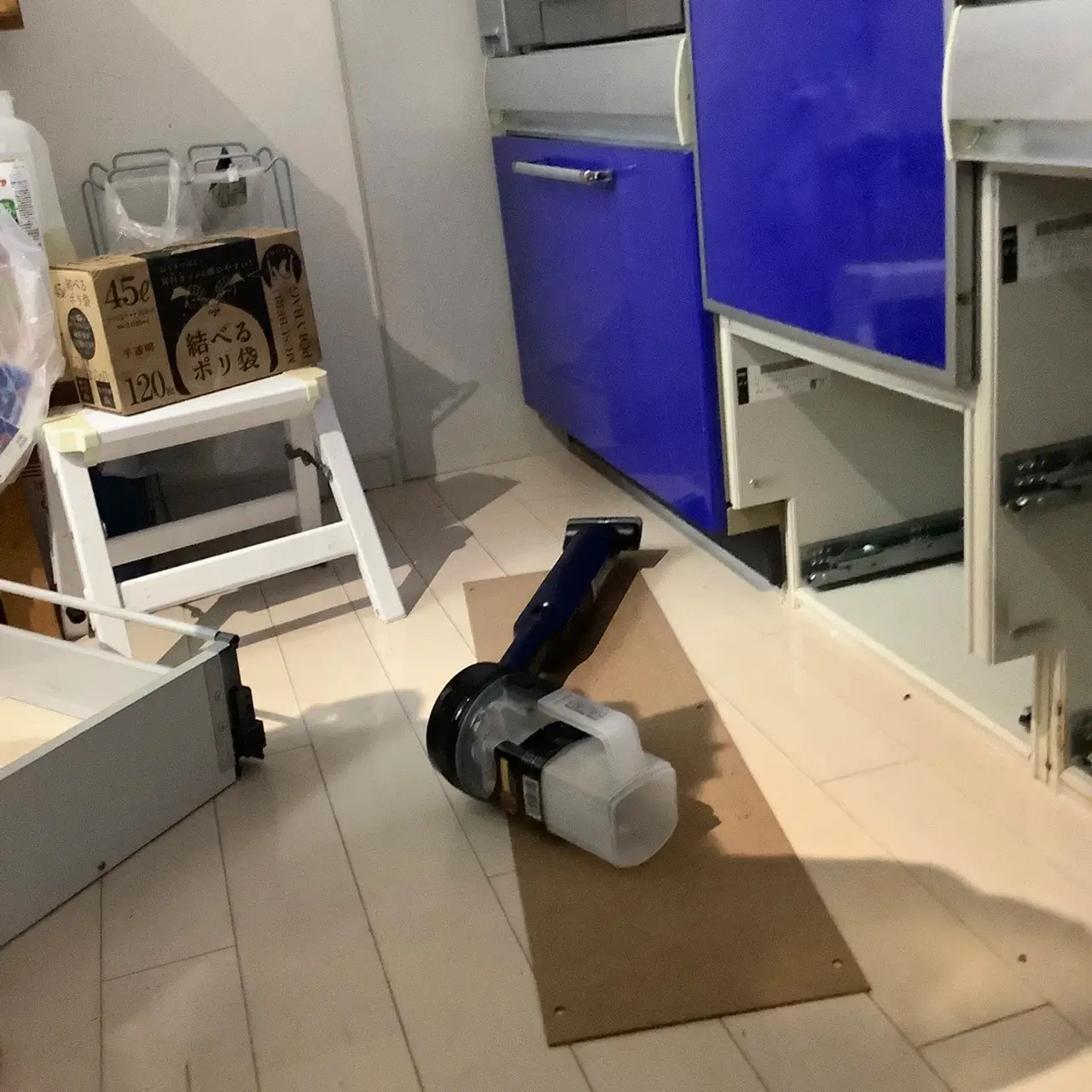 作業中は床や収納周辺に影響が出ないよう養生を行いながら確認を行っています。