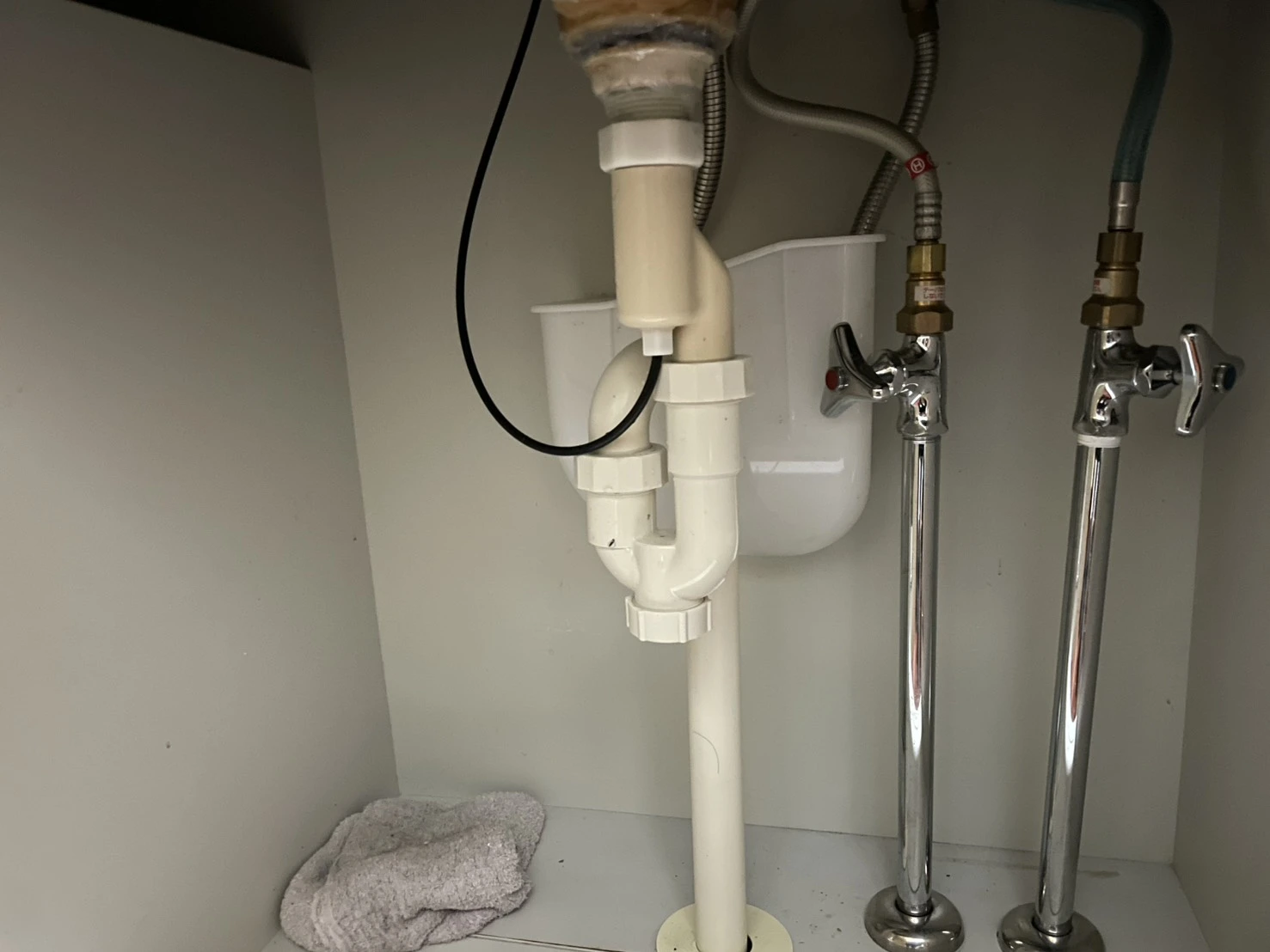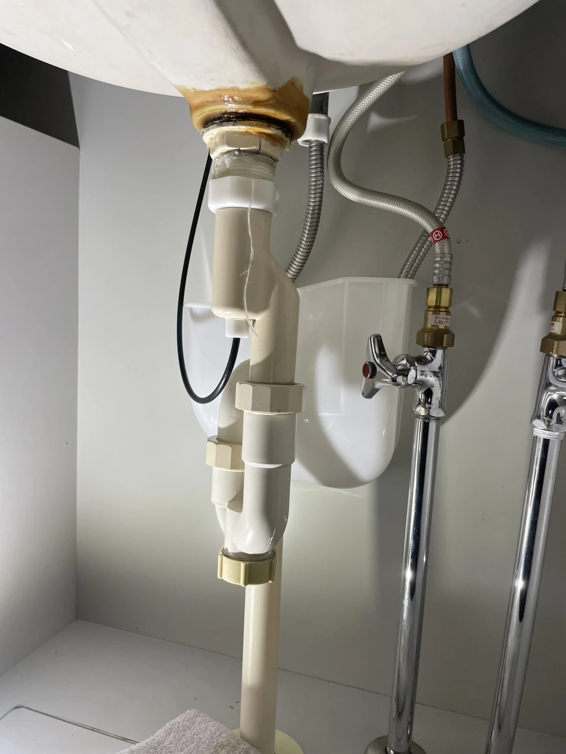 朝の身支度中に洗面台の下からポタポタ音がして気づきました。扉を開けると配管のあたりが濡れていて、タオルを当ててもすぐに湿ってしまう状態。