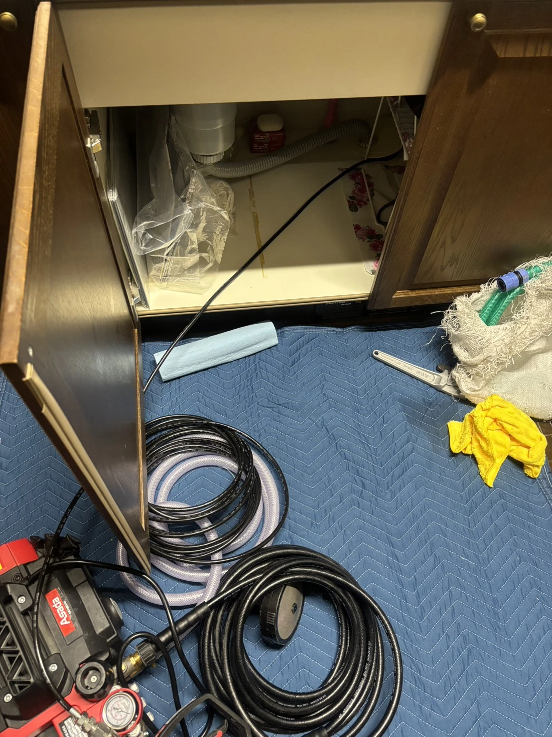 作業中は周囲に水が飛ばないようタオルを敷きながら進め、シンク周りも拭き取りを行いながら対応いたしました。