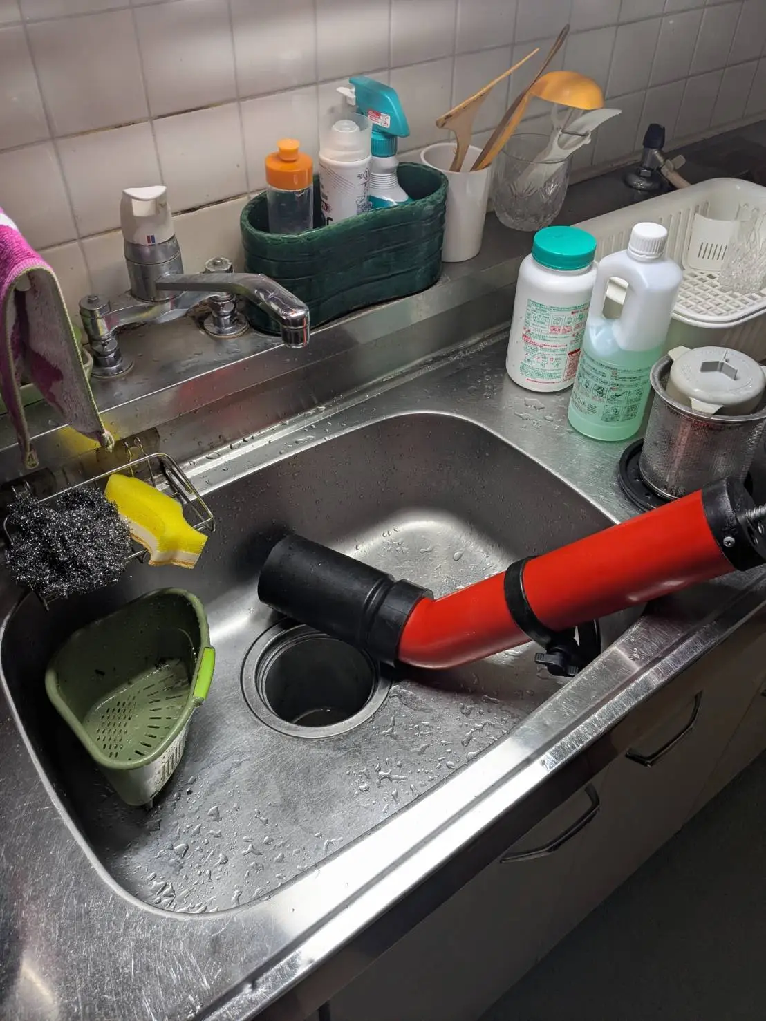 まず薬剤を使用して汚れを分解し、その後ローポンプで圧をかけて排水の通りを回復させました。