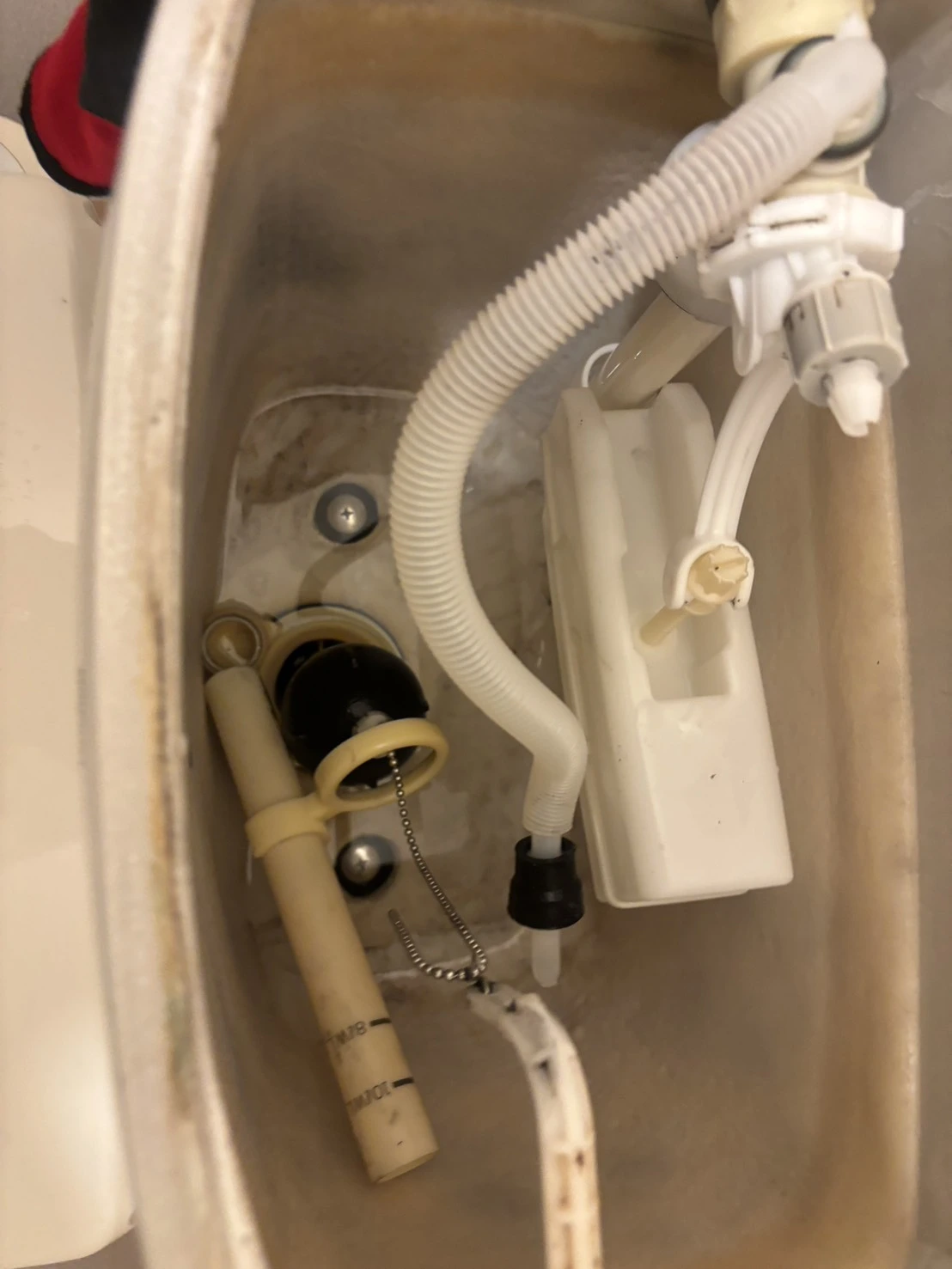 今回はトイレタンク内で水が止まらないとのことで、内部を確認したところ経年劣化による部品の不具合が見られました。